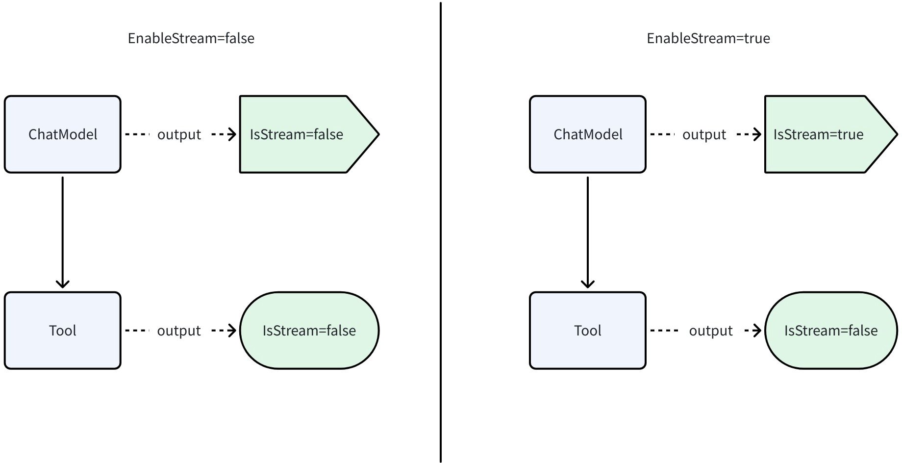 As shown in the diagram below, ChatModel can output either streaming or non-streaming, while Tool can only output non-streaming: