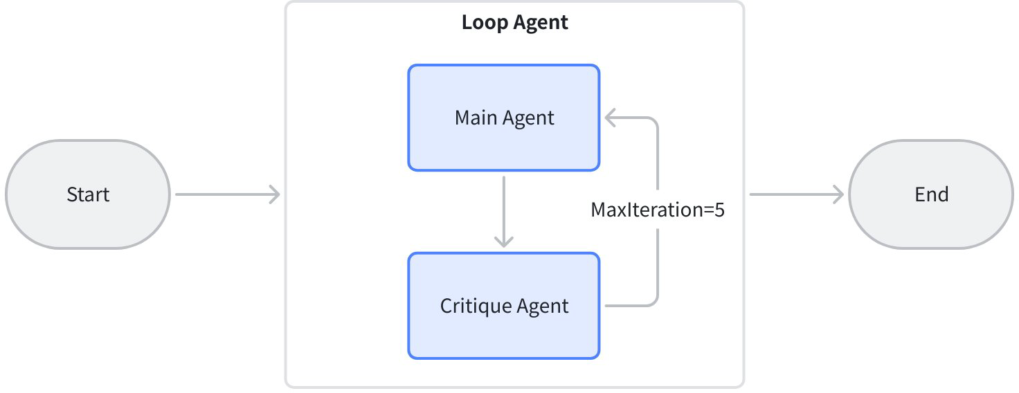 - Loop (Loop Agent): Repeatedly execute sub-Agents until a specific termination condition is met