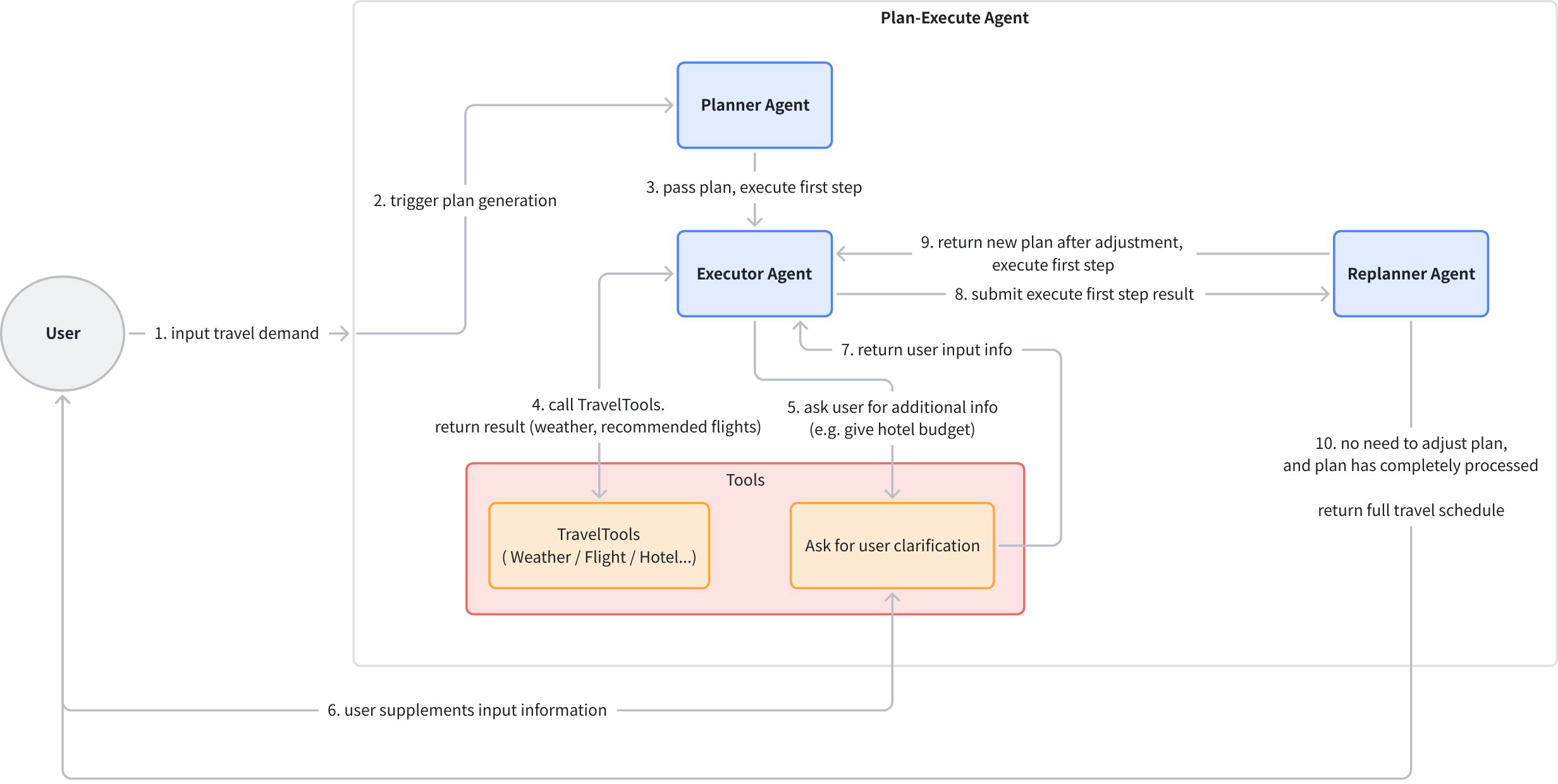 - Plan-Execute: Plan-Execute mode, where the Plan Agent generates a plan with multiple steps, and the Execute Agent completes tasks based on user query and the plan. After execution, Plan is called again to decide whether to complete the task or replan.