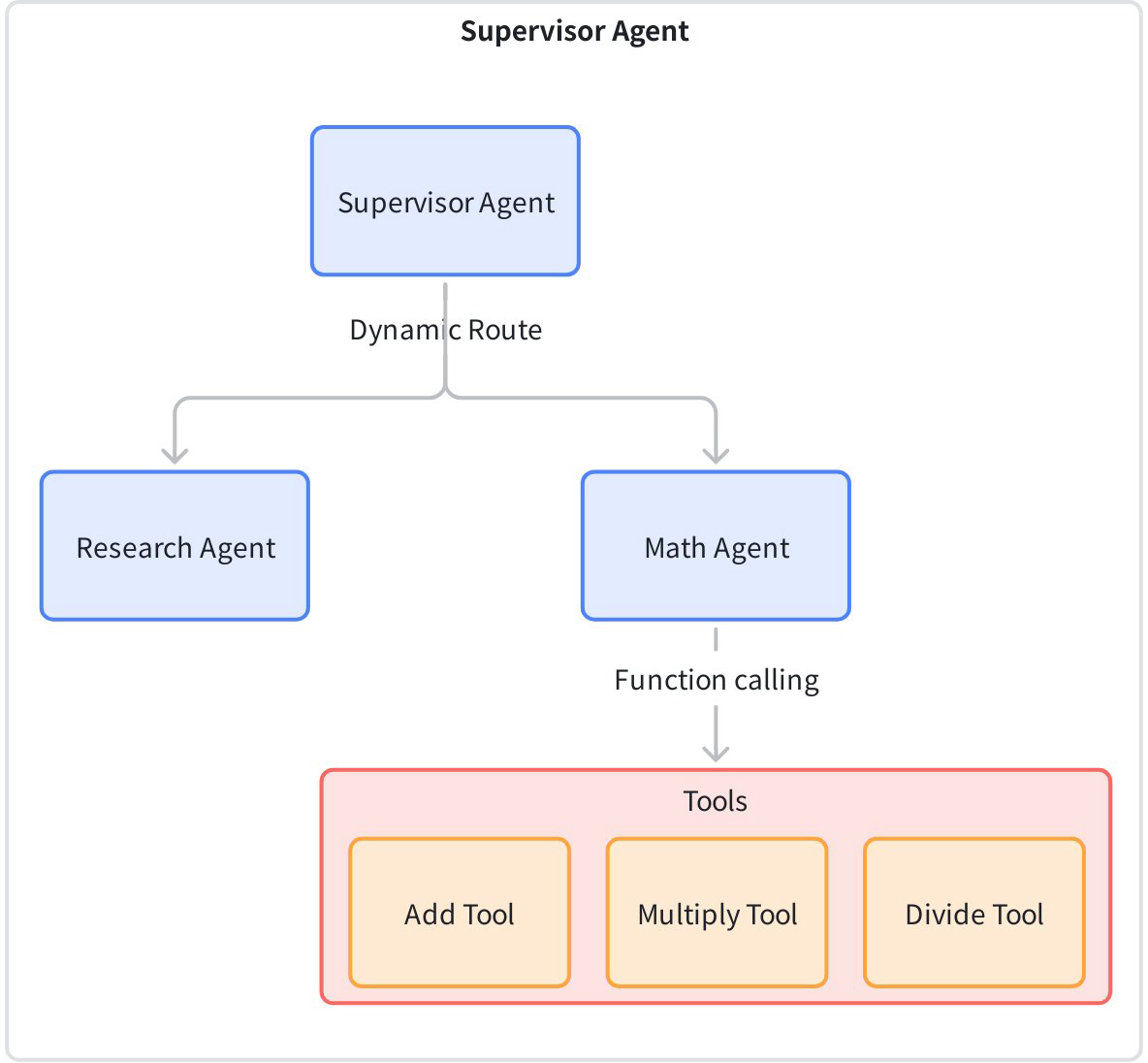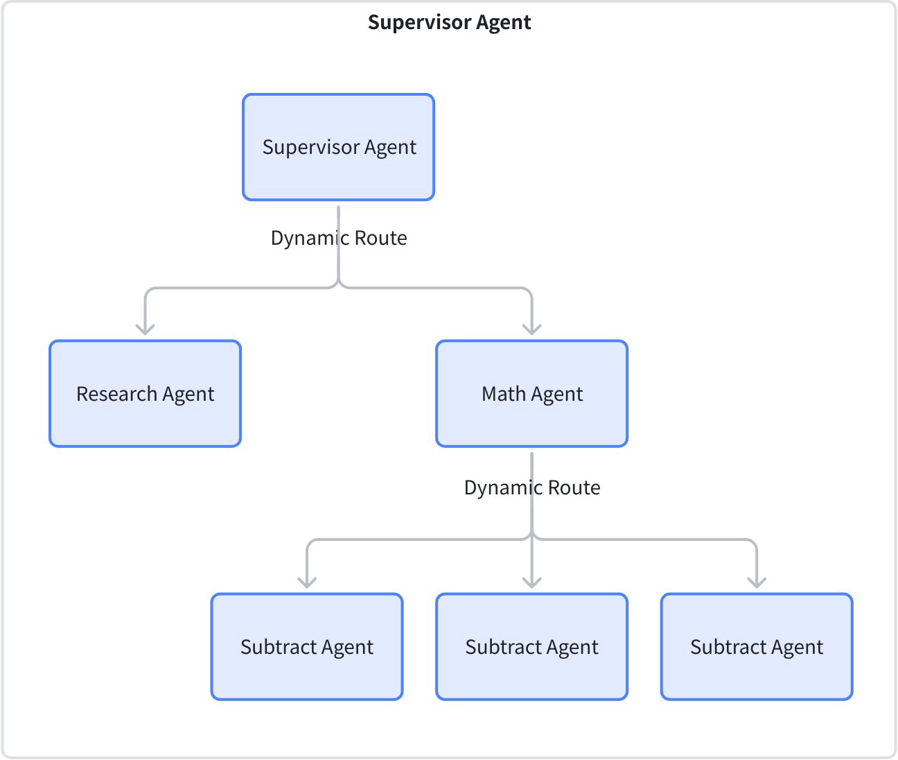 | layered‑supervisor | This use case implements a multi-tier intelligent agent supervision system, where the top-level Supervisor manages Research Agent and Math Agent, and Math Agent is further subdivided into three sub-Agents: Subtract, Multiply, and Divide. The top-level Supervisor is responsible for assigning research tasks and math tasks to lower-level Agents, while Math Agent as a mid-tier supervisor further dispatches specific math operation tasks to its sub-Agents. | ![]() |