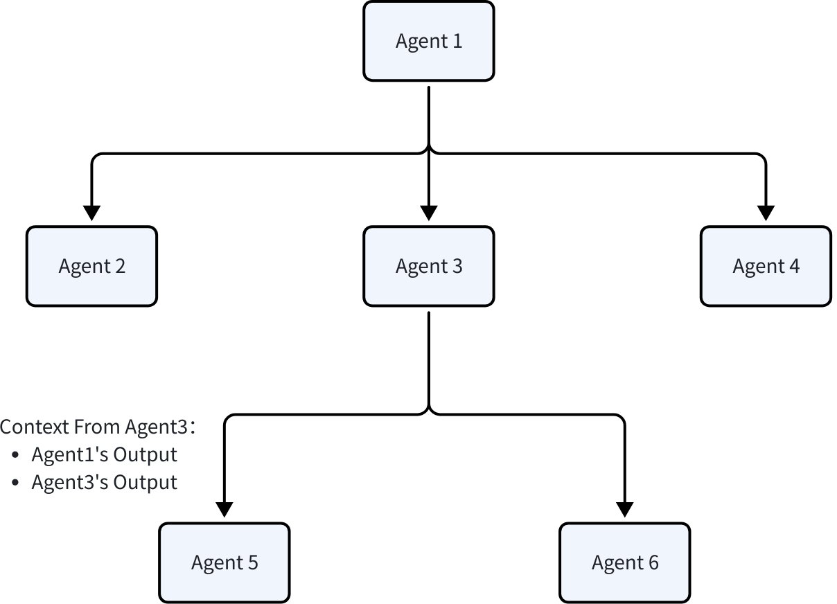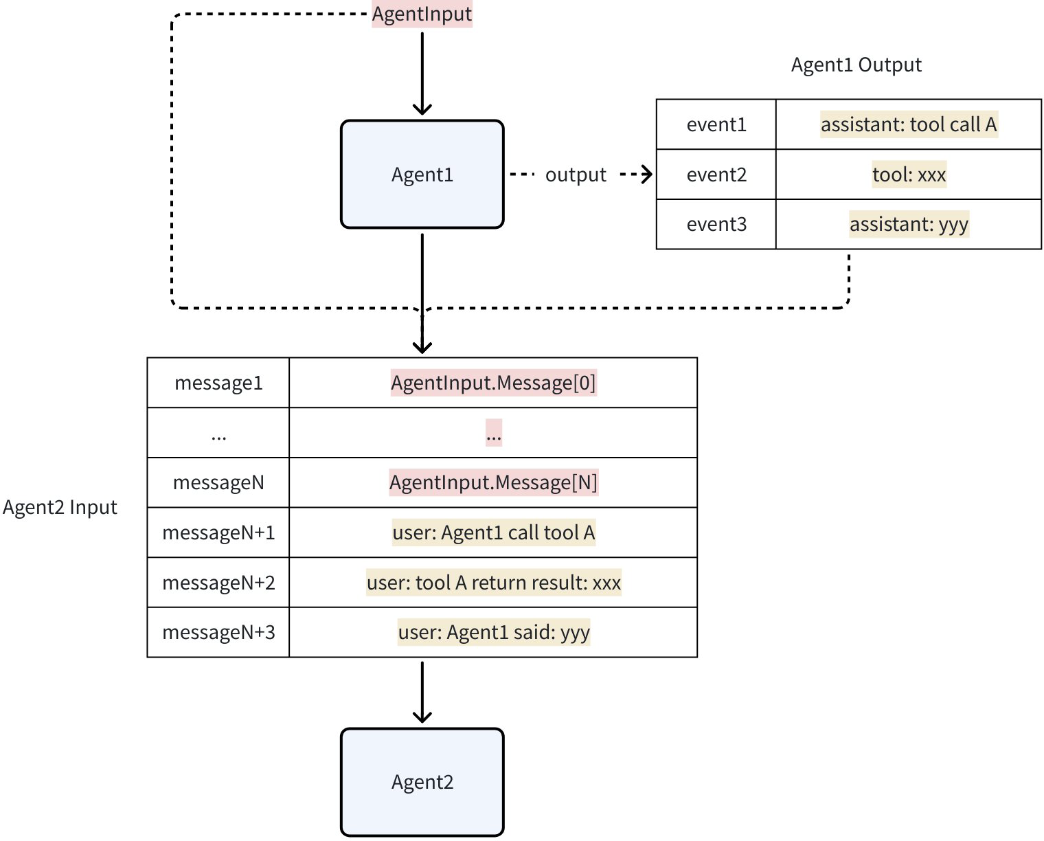 AgentEventis recorded and converted into the next agent’s input. By default, assistant/tool messages from other agents become user messages for the current agent, supplying factual context without confusing roles.