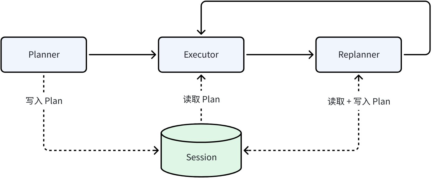 SessionValuesanytime. Typical Plan-Execute flow: planner writes the initial plan; executor reads and runs; replanner updates the plan back into session.