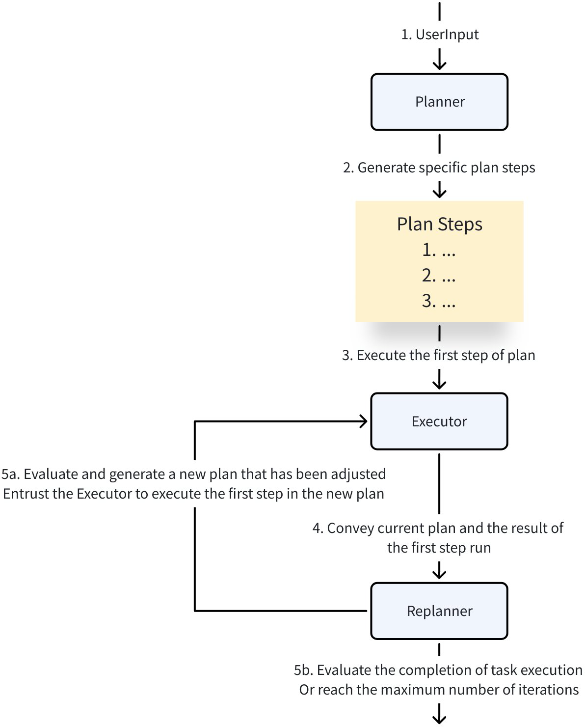 - Loop: Executor + Replanner repeated