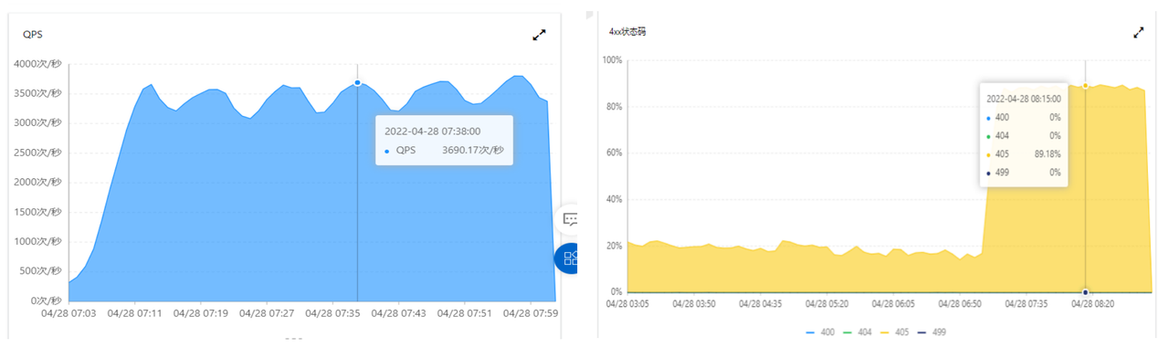 还有一个使用场景,即我们使用的 token 验证接口。每逢到周四的某游戏更新日就会将玩家全部踢下线,等更新完成之后会有大量玩家在短时间内大量请求贪玩平台,我们的二次验证接口会校验这个 token 是否合法正常或是否已失效,认证不通过则需要重新登录。在短时间请求会批量涌过来,会导致原合法 token 变成异常返回,导致玩家会重复登陆,在下面两个图中表现出我们的 QPS 一直都居高不下。