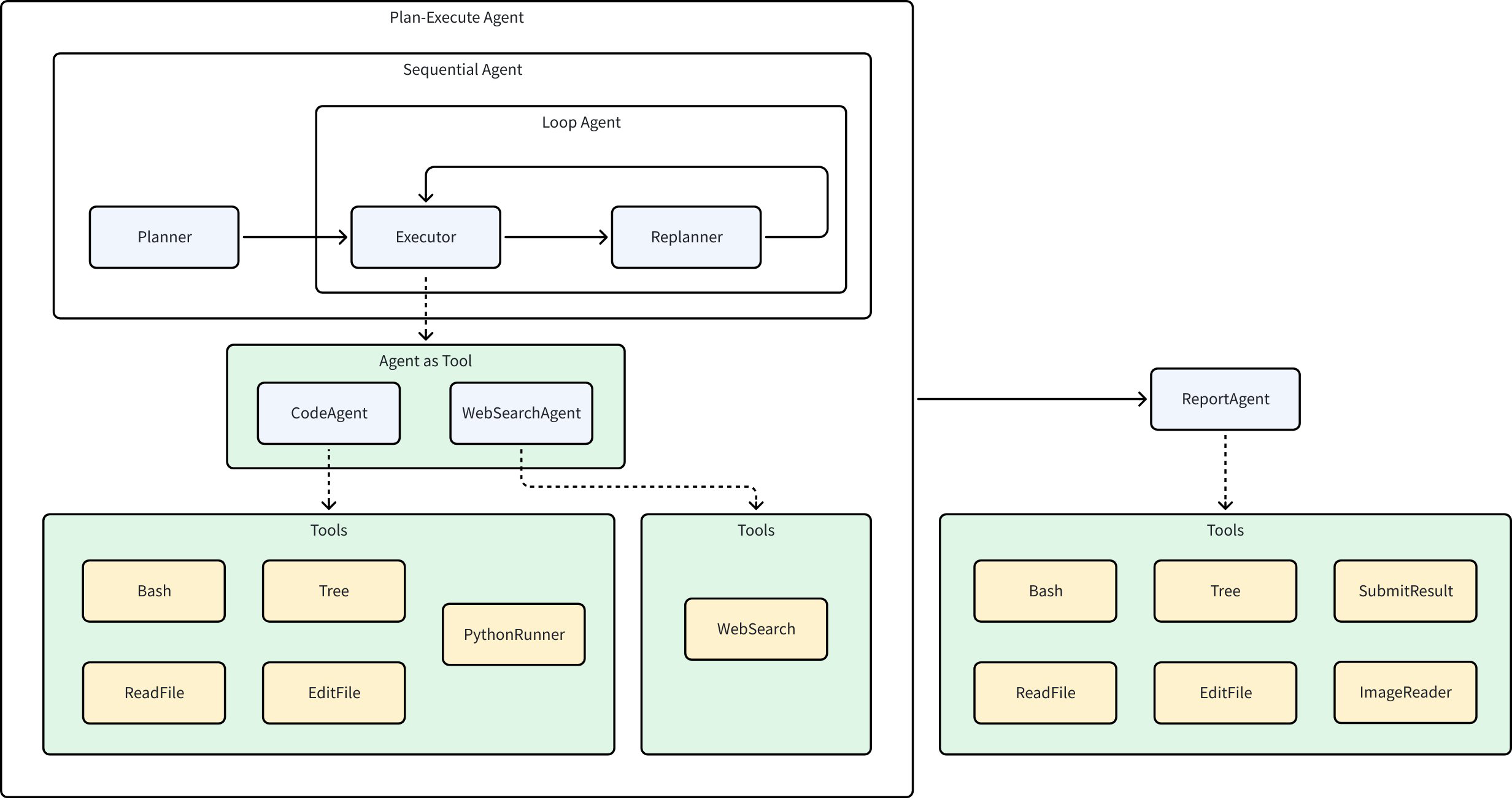- Sequential: Planner → Executor/Replanner (Planner runs once)