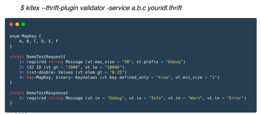下图是代码生成的命令和一个 IDL 注解定义示例,在生成代码的时候指定 Thrift Validator 的插件,我们的插件工具就会解析注解,为用户生成这一套合法性校验的代码。 目前我们也将 Thrift Validator 的功能贡献给了 Apache Thrift。