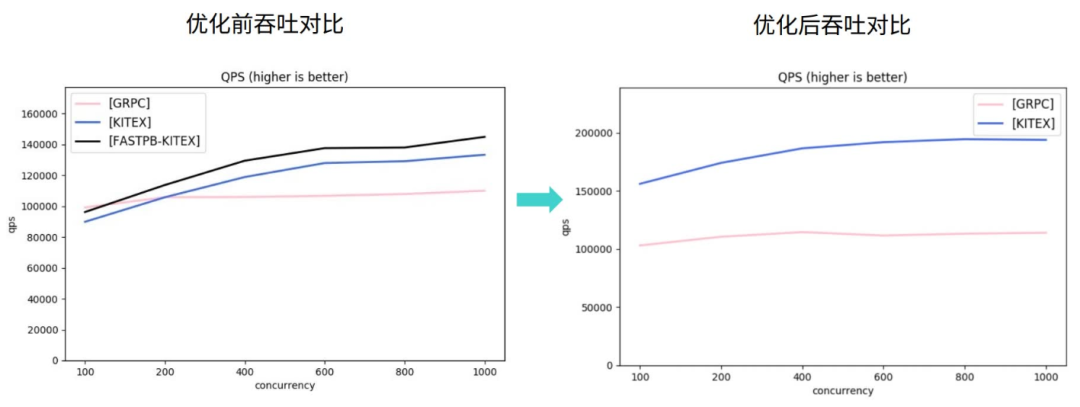 下图中左侧是优化前 Kitex-gRPC 和官方 gRPC 框架对 Unary 请求的压测吞吐对比,在并发比较低的情况下,Kitex 的吞吐并不具有优势, 使用 Fastpb 的时候,Kitex 的吞吐表现会好一些,但低并发的吞吐依然低于官方 gRPC。在优化之后,吞吐对比如右图所示。相比优化前吞吐提升 46% - 70%,相比官方 gRPC 框架,吞吐高 51% - 70%。