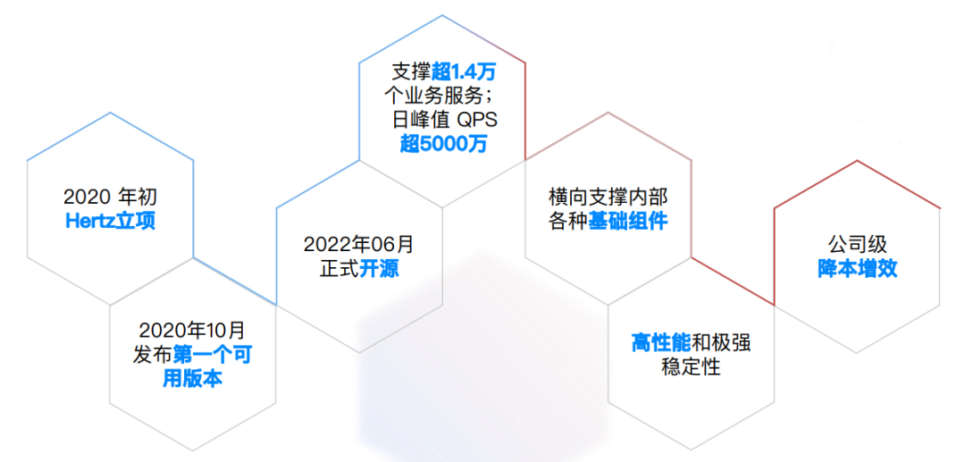 在正式开始介绍第一部分的内容之前,先展示一组关键词。2020 年初 Hertz 立项,2020 年 10 月,Hertz 发布第一个可用版本 。 2022 年 6 月,Hertz 正式开源。 截至目前,Hertz 在字节内部已经支撑超过 1.4 万个业务服务 , 日峰值 QPS 超过 5000 万 。