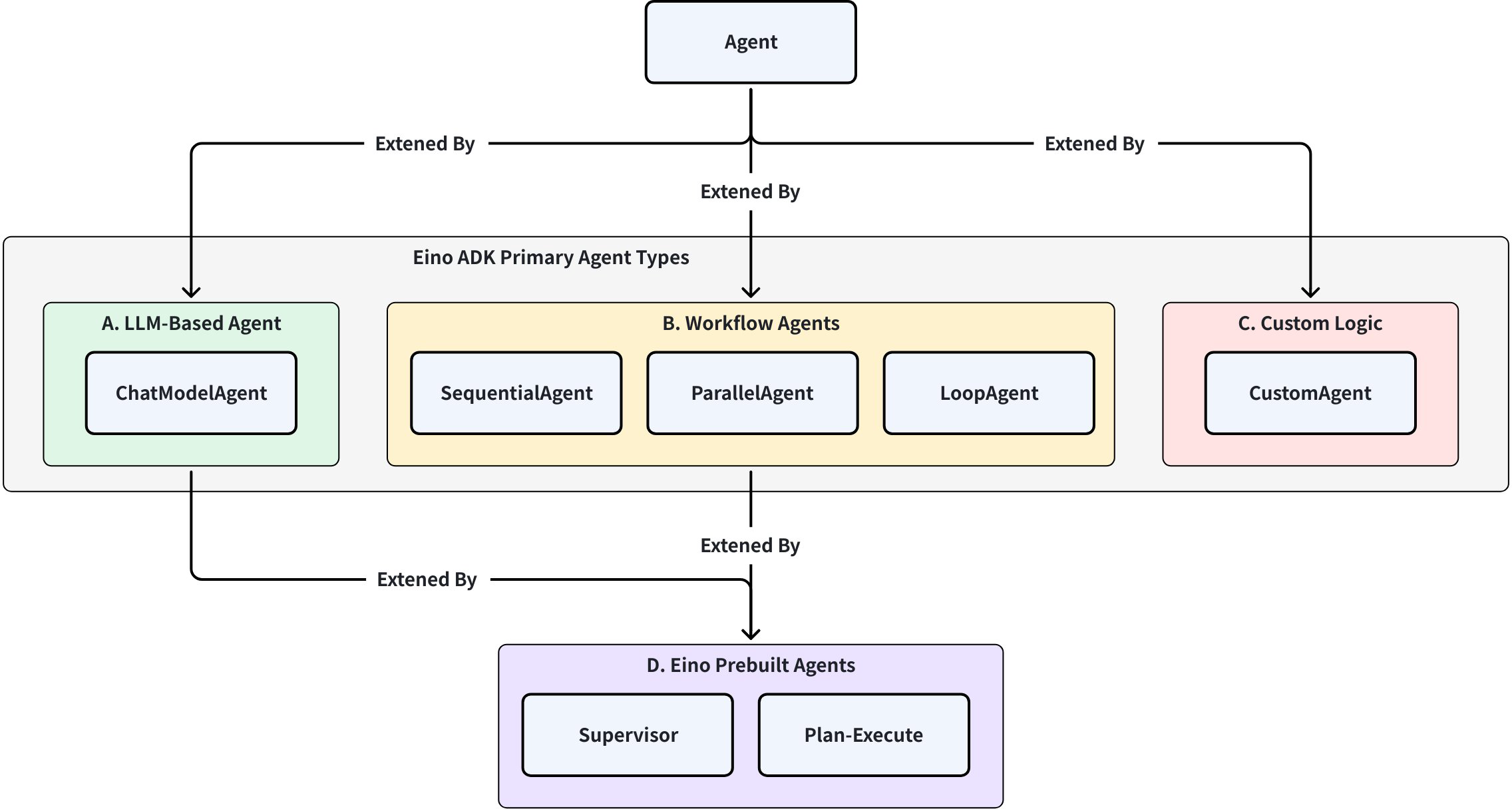 | 类别 | ChatModel Agent | Workflow Agents | Custom Logic | EinoBuiltInAgent(supervisor, plan-execute) |
