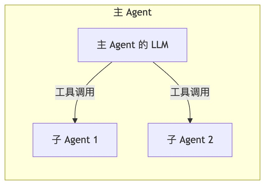 - 层级调用(Agent as Tool):这是最常见的模式(参考 Google ADK 的定义和举例)。一个上层 Agent 将特定子任务委托给专门的“Tool Agent”。例如,一个主 Agent 负责与用户交互,当需要执行代码时,它会调用一个“代码执行 Agent”。在这种模式下,子 Agent 通常是无状态的,不与主 Agent 共享记忆,其交互是一个简单的 Function Call。上层 Agent 和子 Agent 只有一种关系:调用与被调用。因此,我们可以得出,Agent as Tool 的 Multi-Agent 模式,不是“Graph 编排”中的“节点流转”关系。
