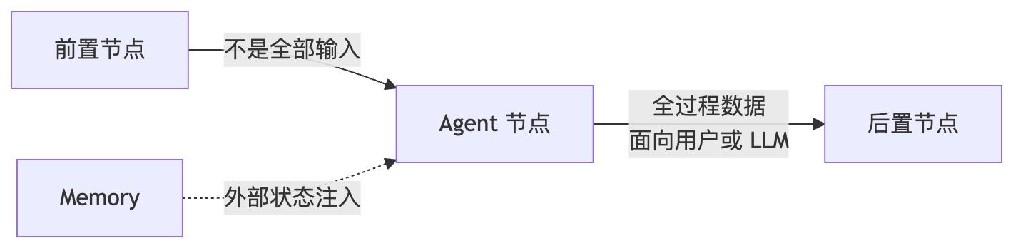 - Agent 的输入来源更为多样,除了能接收来自上游节点的结构化数据外,还严重依赖于自身的会话历史(Memory)。这与 Graph 节点严格依赖其上游输出作为唯一输入的特性形成了鲜明对比。