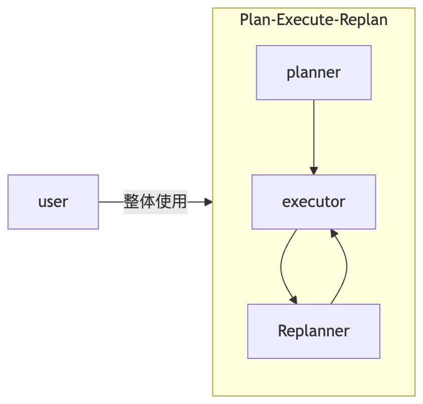 - 预设流程:对于一些成熟的协作模式,如“规划-执行-反思”(Plan-Execute-Replan)(参考 Langchain 的样例),Agent 间的交互顺序和角色是固定的。框架(如 Eino adk)可以将这些模式封装为“预制 Multi-Agent 模式”,开发者可以直接使用,无需关心内部的细节,也不需要手动设置或调整子 Agent 之间的流程关系。因此,我们可以得出,针对成熟的协作模式,“Graph 编排”是封装在预制模式内部的实现细节,开发者不感知。