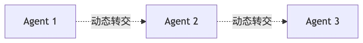 - 动态协作:在更复杂的场景中,Agent 的协作方式是动态的(参考 Google ADK 的定义和举例),可能涉及竞价、投票或由一个“协调者 Agent”在运行时决定。这种模式下,Agent 之间的关系是“Agent 流转”,与“Graph 编排”中的“节点流转”有相似之处,都是“控制权”由 A 到 B 的完全转交。但是,这里的“Agent 流转”可以是完全动态的,其动态特性不仅体现在“可以流转到哪些 Agent”,更体现在“如何做出流转到哪个 Agent 的决策”上,都不是由开发者预设的,而是 LLM 的实时动态行为。这与“Graph 编排”的静态确定性形成了鲜明的对比。因此,我们可以得出,动态协作的 Multi-Agent 模式,从本质上与“Graph 编排”完全不同,更适合在 Agent 框架层面给出独立的解决方案。
